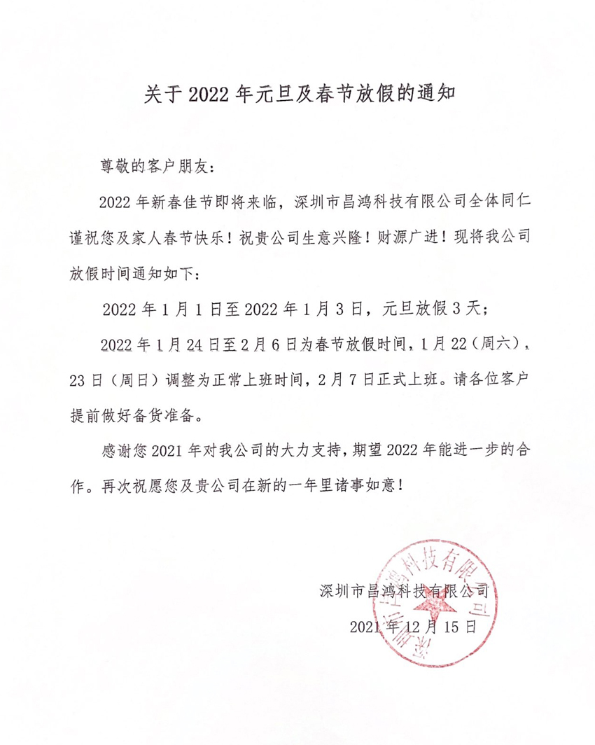 關(guān)于2022年元旦及春節(jié)放假的通知