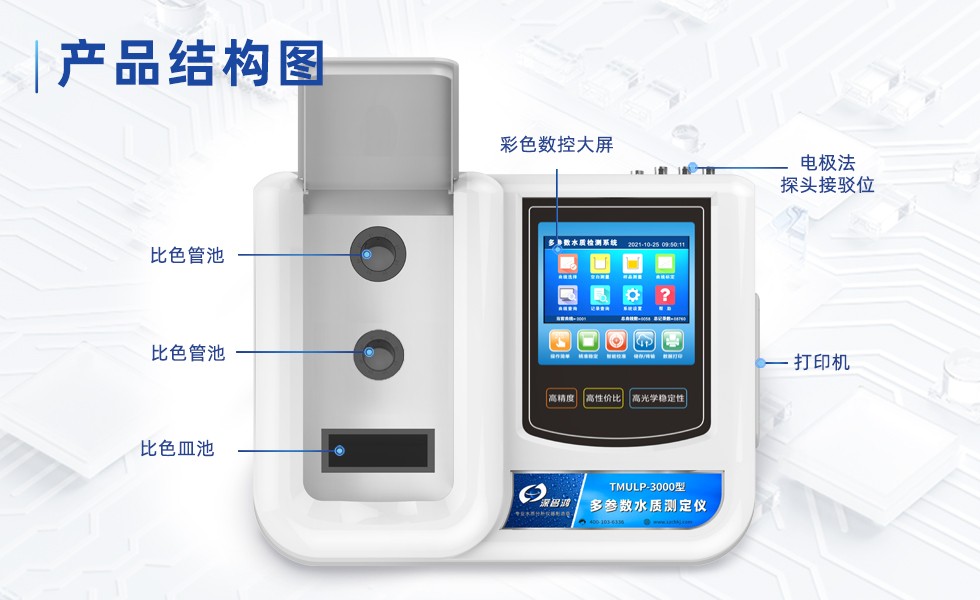 多參數(shù)水質(zhì)測(cè)定儀利用單一波長(zhǎng)的光通過待測(cè)樣品,根據(jù)朗伯-比爾定律,通過測(cè)量吸光度值進(jìn)而計(jì)算樣品所含某物質(zhì)的濃度值。部分測(cè)量參數(shù)如PH、電導(dǎo)率、溶解氧、溫度等用 (電化學(xué))電極法測(cè)量。